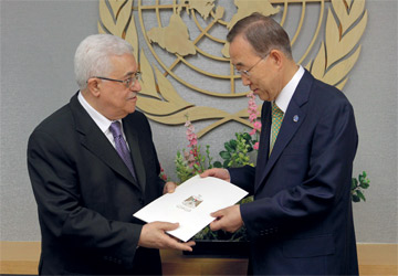 وقدم عباس إلى بان كي مون طلب عضوية دولة فلسطينية في الأمم المتحدة في مكتبه بالأمم المتحدة في مغلف يحمل شعار دولة فلسطين.
