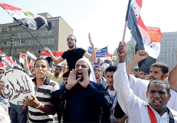 احتشد مصريون أمس، للضغط على المجلس العسكري الذي يدير شؤون البلاد للاسراع بنقل السلطة الى المدنيين وإلغاء قانون الطوارئ الذي كان يستخدم في عهد الرئيس المخلوع حسني مبارك ضد معارضيه. ولبى الآلاف الدعوة للتظاهرات أمس، في اليوم الذي أطلق عليه اسم جمعة (استرداد الثورة)، وسط مشاعر استياء متزايدة من الطريقة التي يدير بها المجلس العسكري الفترة الانتقالية.