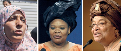 فازت بجائزة «نوبل للسلام»، أمس، الناشطة اليمنية المدافعة عن حقوق الإنسان توكل كرمان، ورئيسة ليبيريا إلين جونسون سيرليف، ومواطنتها ليما غبويي، التي حشدت المرأة الليبيرية ضد الحرب الأهلية.