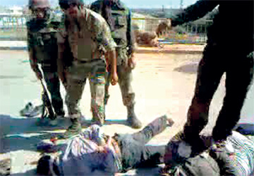 صورة من فيديو يظهر عناصر الجيش وهم يعتدون بالضرب على متظاهرين مقيدين ومعصوبي الأعين في حمص. أ.ف.ب
