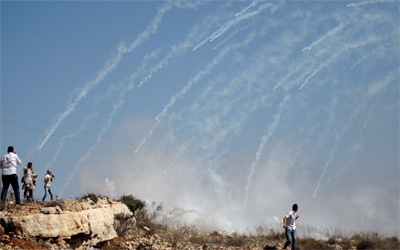 الاحتلال يمطر الفلسطينيين بغاز الدموع خلال تظاهرة ضد توسيع مستوطنة حالاميش في الضفة. أ.ب