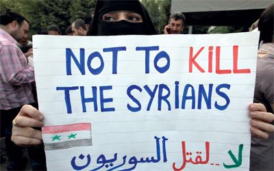 سيدة تحمل لافتة تندد بعمليات القمع السورية أمام مقر الجامعة العربية في القاهرة. إي.بي.إيه