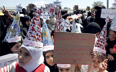 تظاهرة في صنعاء تهنئ ليبيا بنهاية القذافي وتتوعد صالح وعائلته. أ.ب