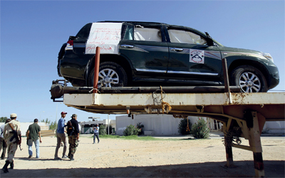آخر سيارة استخدمها القذافي لحظة القبض عليه معروضة للمارة في مصراتة. أ.ب