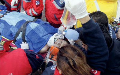 أخرج عمال الإنقاذ، أمس، امرأة عمرها 27 عاماً من تحت أنقاض مبنى منهارٍ وهي على قيد الحياة بعد نحو ثلاثة أيام من وقوع زلزال قوي أودى بحياة أكثر من 400 شخص، وشرد عشرات الآلاف في جنوب شرق تركيا. وأصيبت المرأة واسمها جوزدي باهار بأزمة قلبية شديدة أثناء نقلها إلى أحد المستشفيات ببلدة ارجس، احدى أكثر المناطق تضرراً بزلزال الاحد الماضي الذي بلغت قوته 7.2 درجات. وتمكن الاطباء من انعاشها، وقال مراسلو «رويترز » في الموقع انها في حالة حرجة.