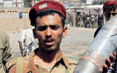 جندي منشق يعرض قذيفة أطلقتها قوات صالح في صنعاء. رويترز