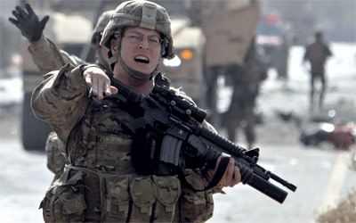 جندي أميركي بالقرب من موقع التفجير الانتحاري بكابول. أ.ب