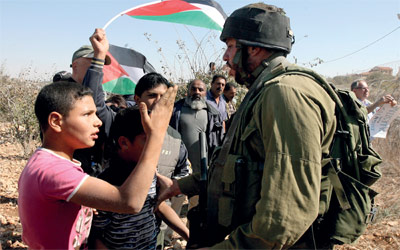 فتى فلسطيني يواجه جندياً إسرائيلياً يحاول منعه ومتضامنين من الوصول إلى أراضي قرية بيت أمر بالضفة. إي.بي.إيه
