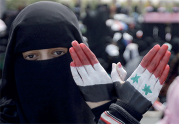 يمنية رسمت علمي سورية واليمن في تظاهرة ضد صالح. أ.ب