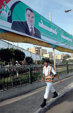 شرطي مصري يمر أسفل لافتة انتخابية. إيه.بي.إيه