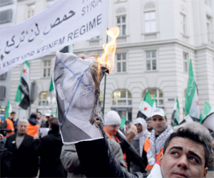 متظاهر يحرق صورة الرئيس السوري خلال تظاهرة مناهضة للنظام في فيينا. أ.ب