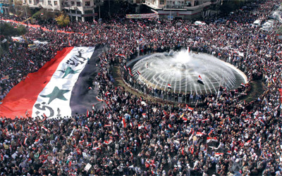 مؤيدو الأسد خلال تجمع وسط دمشق تنديداً بقرار الجامعة العربية تعليق عضوية سورية. أ.ب