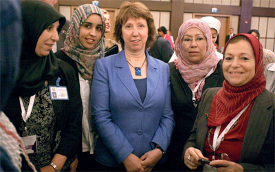 أشتون تتوسط عدداً من النساء الليبيات خلال جولتها الأخيرة في ليبيا. إيه.بي.إيه