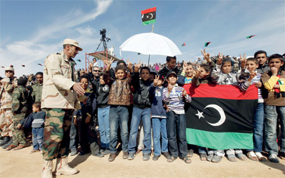 أطفال يمسكون بمظلة القذافي خلال الاحتفال بتحرير ليبيا. رويترز
