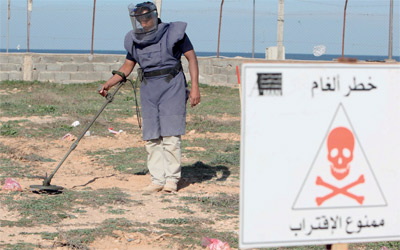 خبير إزالة ألغام ليبي يعمل في حقل الألغام بالقرب من مطار معيتيقة. إي.بي.إيه