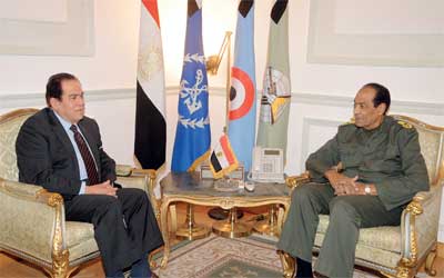 المشير طنطاوي خلال اجتماعه بالجنزوري وتكليفه بتشكيل الحكومة الجديدة. أ.ف.ب
