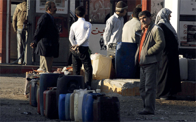 سوريون يقفون أمام محطة وقود في ضواحي دمشق لشراء المازوت بعد أن فُقد بسبب الأزمة. رويترز