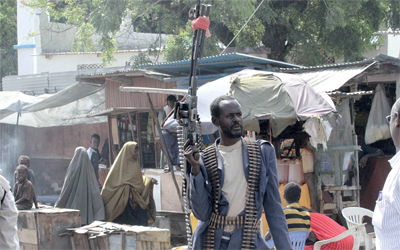 جندي حكومي في أحد شوارع مقديشو لتأمين موكب كي مون. رويترز