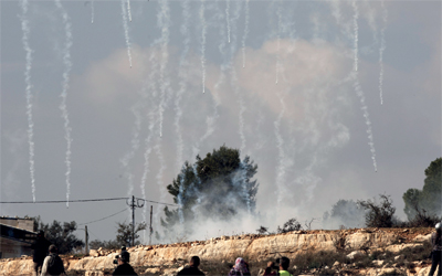 الاحتلال يمطر المتظاهرين ضد الاستيطان في قرية النبي صالح بقنابل «غاز الدموع». إي.بي.إيه