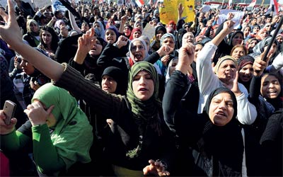 احتشد آلاف من المصريين في ميدان التحرير بقلب القاهرة، أمس، في تظاهرة أطلقوا عليها «جمعة رد الشرف»، تعبيرا عن الاحتجاج على الاعتداء على متظاهرين ومتظاهرات أمام مجلس الوزراء الاسبوع الماضي، وأغلق المتظاهرون الميدان تماما أمام حركة السيارات، فيما احتشد الآلاف في ميدان العباسية شرق القاهرة في تظاهرة «لا للتخريب» المؤيدة للمجلس العسكري وضد «محاولات اسقاط الدولة»، بينما يقول المصريون في الاقاليم خارج العاصمة، حيث لا تسمع هتافات المحتجين في التحرير ضد المجلس، إن محاسبة حكامهم يجب أن تكون من خلال صناديق الاقتراع وليس الشارع.