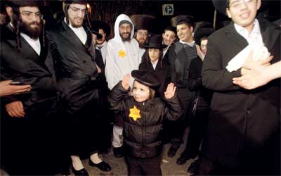 وارتدى المتظاهرون، وبينهم أطفال، ملابس مخططة بالأبيض والأسود، مثل التي كان يرتديها اليهود المعتقلون في معسكرات النازية بألمانيا، كما ارتدوا ما يسمى «نجمة اليهود»، المكتوب في وسطها كلمة «يهودي».