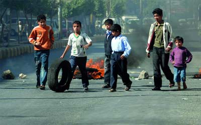 أطفال يمنيون محتجون يحرقون الإطارات في أحد شوارع صنعاء. أ.ف.ب