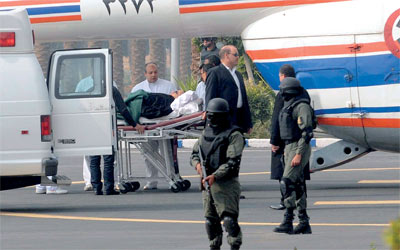 مبارك خلال نقله بالمروحية إلى مقر المحاكمة أمس. إي.بي.إيه