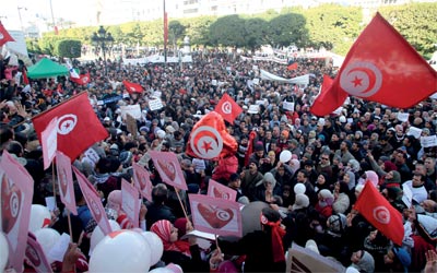 ومنذ الصباح الباكر بدأ التونسيون يتوافدون، أمس، على وسط العاصمة، ومنهم من قضى الليلة قبل الماضية امام المسرح البلدي في شارع الحبيب بورقيبة الرئيس، الذي شهد في 14 يناير اكبر الاحتجاجات.