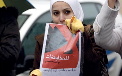 فلسطينية في رام الله ترفع لوحة تعبيراً عن رفضها المفاوضات. رويترز