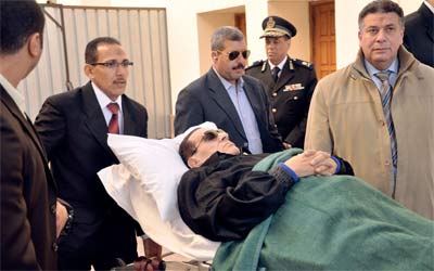 مبارك في طريقه إلى إحدى جلسات المحاكمة. أ.ف.ب