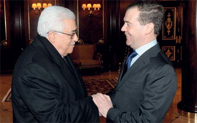 وكان عباس وصل إلى موسكو، الخميس الماضي، في زيارة عمل تستمر ستة أيام، وناقش، الجمعة، مسألة التسوية في الشرق الأوسط مع نظيره الروسي ديمتري ميدفيديف. وقال الرئيس الفلسطيني ان فلسطين تدعم عملية التفاوض باعتبارها الطريقة الوحيدة لتحقيق تسوية سلمية، لكنه رأى ان إسرائيل هي المسؤولة الوحيدة عن المشكلات المتبقية بين الطرفين. وأضاف «أخيراً، أحرق مستوطنون خمسة مساجد في الضفة الغربية»، مشيراً إلى استمرار الهجمات من المستوطنات الإسرائيلية على الفلسطينيين.