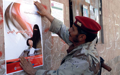 جندي يمني منشق يضع ملصقاً انتخابياً في أحد شوارع صنعاء. رويترز