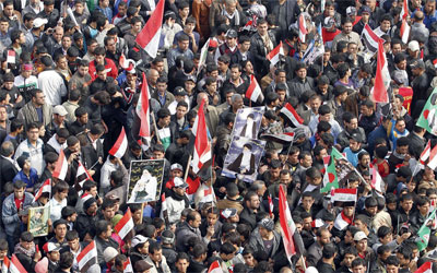 وعند منصة تتوسط شارعا رئيساً في مدينة الصدر، رفع العلم العراقي الى جانب أعلام دول عربية هي مصر وتونس وليبيا والبحرين. وقال منظمو المهرجان الذين ينتمون الى التيار الصدري، إن ممثلين عن هذه الدول العربية التي شهدت في معظمها حركات احتجاجية ضد انظمتها، شاركوا في الحفل، إلى جانب وزراء ونواب ورجال دين عراقيين. ووسط إجراءات امنية مشددة من قبل قوات الجيش والشرطة، سار عشرات الآلاف من اعضاء التيار ضمن تشكيلات عسكرية غير مسلحة في الشوارع، رافعين أعلاماً عراقية.