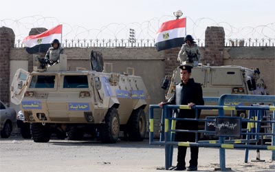 أفراد من الجيش والأمن خارج أكاديمية الشرطة في القاهرة حيث محاكمة مبارك. إي.بي.إيه