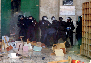 اندلعت مواجهات، أمس، بين عشرات الفلسطينيين الموجودين في المسجد الأقصى والشرطة الإسرائيلية التي انتشرت بكثافة في ساحاته، حيث أصيب عدد من الفلسطينيين برضوض، فيما اعتقل الجيش الإسرائيلي ثلاثة آخرين أمس خلال المواجهات، ما دفع منظمة التعاون الإسلامي الى ادانة اقتحام المسجد الأقصى من قبل الاحتلال.