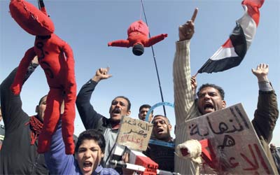 متظاهرون يشنقون دمية لمبارك أمام مقر محاكمته أمس. رويترز