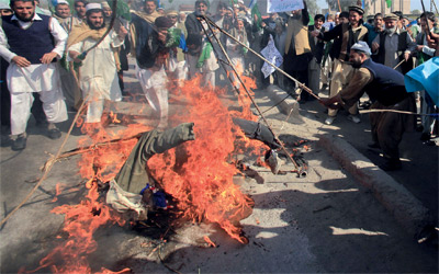 أفغان غاضبون يحرقون دمية لأوباما في احتجاجات بيشاور. رويترز