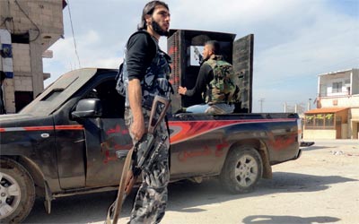 عنصران من «الجيش السوري الحر» في منطقة البياضة في حمص. رويترز