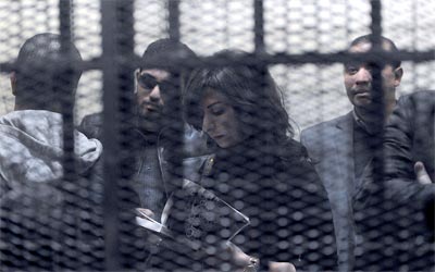 عدد من نشطاء الجمعيات الأهلية في قفص الاتهام خلال إحدى الجلسات قبيل إطلاقهم. أي.بي.أيه