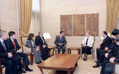 ونقلت وكالة الانباء السورية الرسمية (سانا) عن الاسد قوله خلال استقباله رئيسة لجنة الصداقة الاوكرانية السورية في البرلمان الاوكراني، ووفد مرافق ان «الشعب السوري الذي أفشل المخططات الخارجية في السابق بارادته ووعيه اثبت قدرته مجددا على حماية وطنه وبناء سورية المتجددة، من خلال تصميمه على متابعة الاصلاحات بالتوازي مع مواجهة الارهاب المدعوم من الخارج».