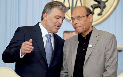 وقال الرئيس التونسي منصف المرزوقي، في مؤتمر صحافي مشترك مع غول في القصر الرئاسي، إن تونس تعارض أيضاً أي تدخل غير عربي في سورية، وترغب في المشاركة في أي قوة حفظ سلام عربية ترسل إلى هناك.