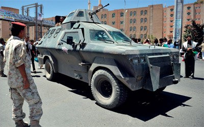 جندي يمني أمام مدرعة في احد شوارع صنعاء. إي.بي.إيه