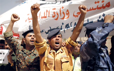 ضباط شرطة يمنيون يتظاهرون رفضاً للترقيات الجديدة. رويترز