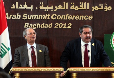 الأمين العام المساعد للجامعة العربية أحمد بن حلي ووزير خارجية العراق هوشيار زيباري في مؤتمر صحافي قبل انطلاق القمة العربية. إي بي أيه