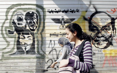 مصريتان تسيران بجوار جدارية معادية للمجلس العسكري في قلب القاهرة. رويترز