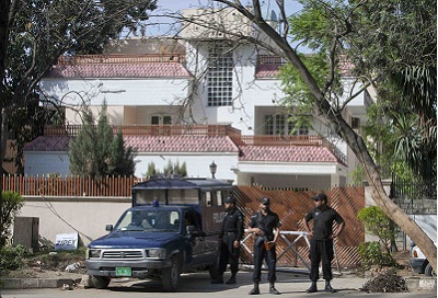 الشرطة الباكستانية خارج المنزل الذي تقيم فيه عائلة بن لادن. رويترز