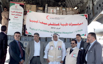 تنفيذاً لتوجيهات صاحب السمو الشيخ خليفة بن زايد آل نهيان، رئيس الدولة، حفظه الله، أمر الفريق أول سمو الشيخ محمد بن زايد آل نهيان، ولي عهد أبوظبي نائب القائد الأعلى للقوات المسلحة، بإرسال طائرة إغاثة ومعونات طبية عاجلة لمساندة الشعب الليبي الشقيق، وتخفيف تداعيات الظروف التي تمر بها الشقيقة ليبيا. فقد وصلت إلى مطار العاصمة طرابلس طائرة إغاثة محملة بكميات كبيرة من الأدوية والمعدات الطبية وثلاث سيارات إسعاف تم تخصيصها لمستشفى مدينة سبها الذي يعاني شحاً في هذا الجانب الحيوي، وذلك في إطار حرص قيادة الدولة على دعم الأوضاع الصحية في الشقيقة ليبيا، ومساندة الشعب الليبي الشقيق منذ تفاقم الأحداث التي شهدتها ليبيا في الفترة الأخيرة.
