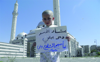 صبي يحمل لافتة ضد الأسد أمام مسجد خالد بن الوليد في حمص. رويترز