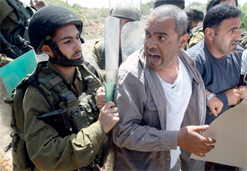 جندي إسرائيلي يدفع فلسطينياً خلال احتجاج في بيت أمر بالضفة الغربية. إي.بي.إيه
