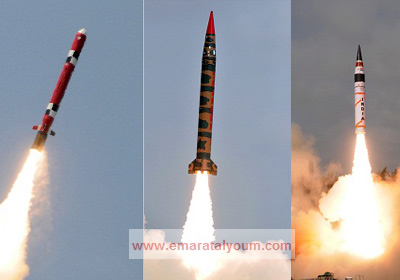صواريخ يمكنها حمل رؤوس نووية، من اليمين: صاروخ أغني 5 الهندي الذي يصل مداه إلى أكثر من 5 آلاف كلم وصاروخ شاهين -1 أي الباكستاني (1000 كلم) وصاروخ كوري شمالي لم يصرح بإسمه ويبلغ مداه (1000 كلم).